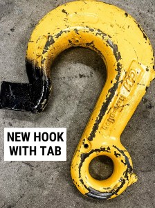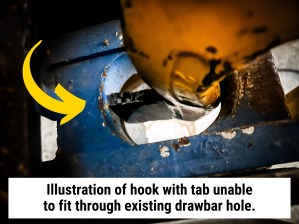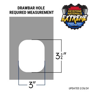 Tractors and trucks hooking to the Class 8 sleds at Keystone Nationals must have a drawbar hole that can accommodate the new hook and tab on the sled. This requires a hole that is 3″ wide by 3.75″ long. See illustration below for further dimensions, along with photo of the new hook.